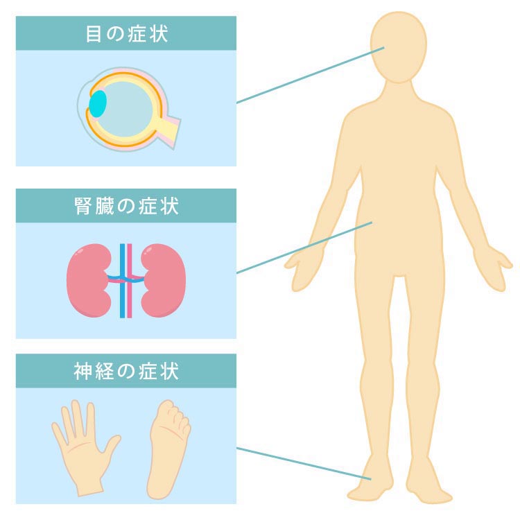 細い血管が障害されて起こるものの代表的な症状としては、以下の糖尿病三大合併症が知られています。
